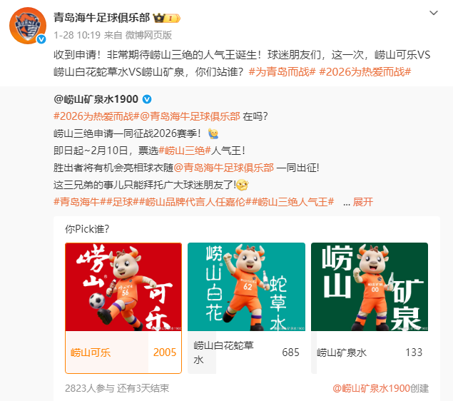 值得一提的是,青岛海牛的胸前广告已经呼之欲出,并确定为“崂山三绝”(崂山可乐、崂山白花蛇草水、崂山矿泉)中的一款,目前这三款产品正在火热打榜中,相信很快会有结果。