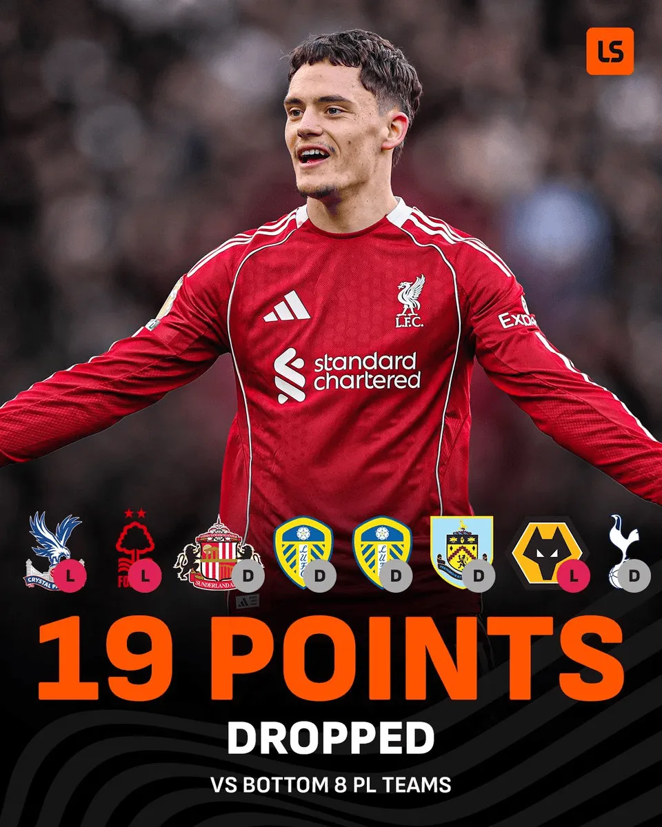 虎扑03月16日讯 本赛季英超,利物浦在面对目前积分榜倒数前8的球队时表现并不稳定。在对阵水晶宫、诺丁汉森林、桑德兰、利兹联、伯恩利、狼队和热刺等下半区球队的比赛中,利物浦累计丢掉19个积分。在这些下半区球队中,利物浦仅对西汉姆联实现赛季双杀,其余球队都至少在一场比赛中从红军身上拿到积分。来源:X虎扑03月16日讯 本赛季英超,利物浦在面对目前积分榜倒数前8...